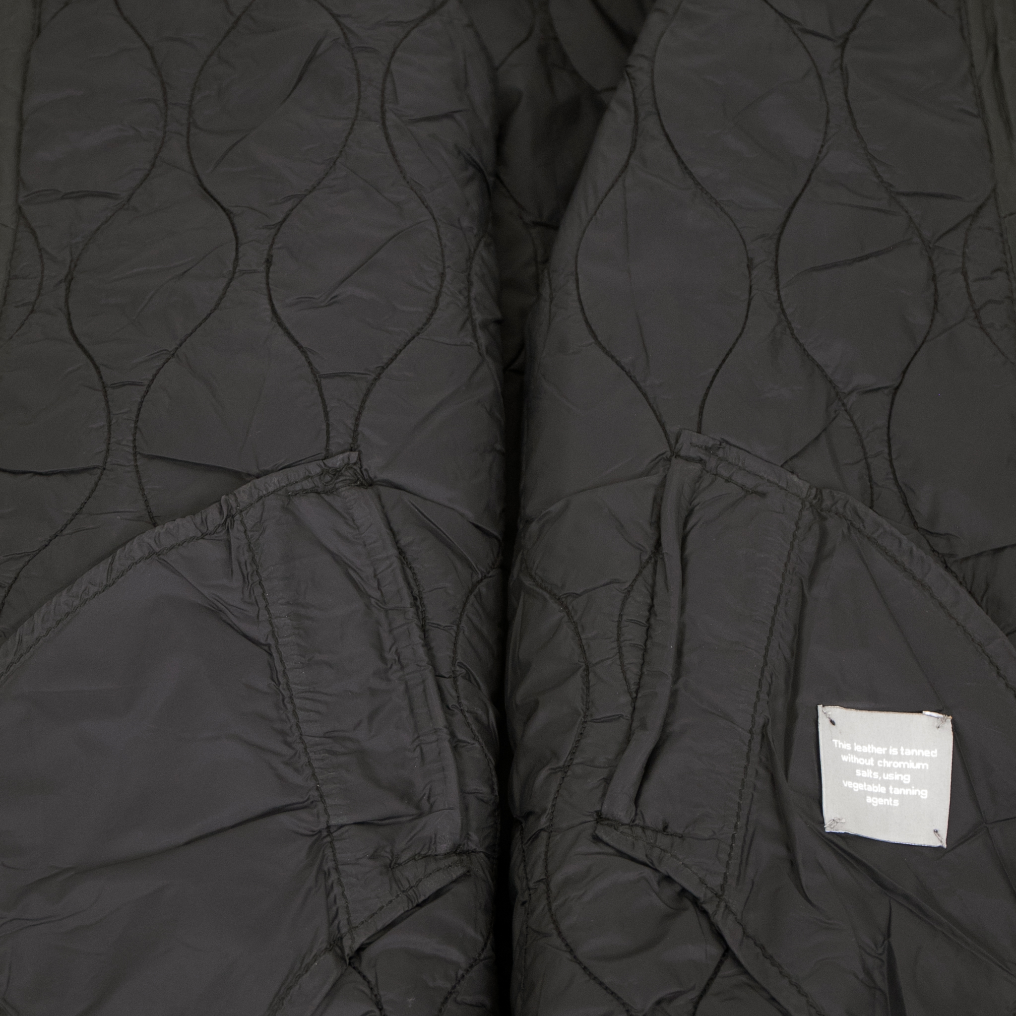 • der Stehkragen und der Ärmelbund sind aus gerafften Leder
