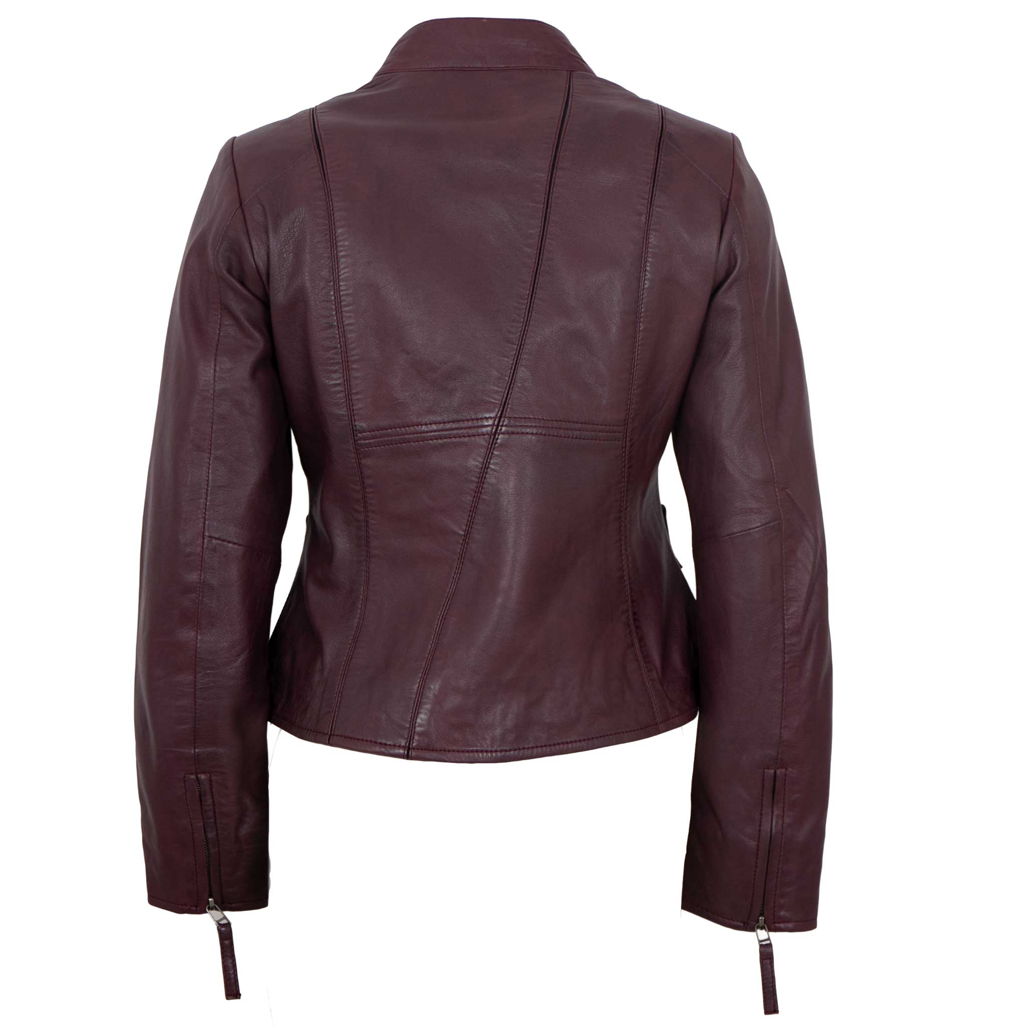 Gleichzeitig sorgen sie für zusätzliche Bewegungsfreiheit und eine optimale Passform. Zwei seitliche Reißverschlusstaschen bieten praktischen Stauraum für wichtige Kleinigkeiten, während der lässige Stehkragen den modernen Look unterstreicht. Stilvolle Lederbändchen an den Zippern runden das Design harmonisch ab und setzen besondere modische Highlights. Eine vielseitige Lederjacke, die Komfort, Qualität und Stil perfekt vereint – ideal für Frauen, die ein modernes Statement setzen möchten.
