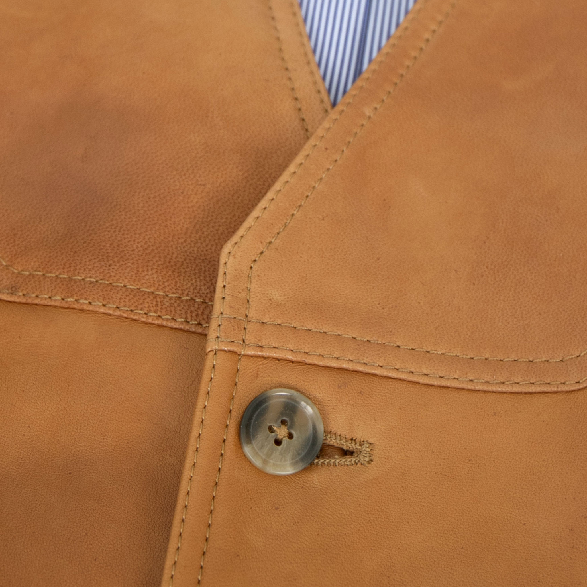 Typisch für das zeitlose Design sind der V-Ausschnitt sowie der vierreihige Knopfverschluss, die sich harmonisch in den stilvollen Look einfügen und den modischen Anspruch unterstreichen. Die gekonnt platzierten Außentaschen bieten praktischen Stauraum für alle wichtigen Utensilien. Diese Lederweste ist ein vielseitiger Begleiter für einen gepflegten, maskulinen Auftritt.