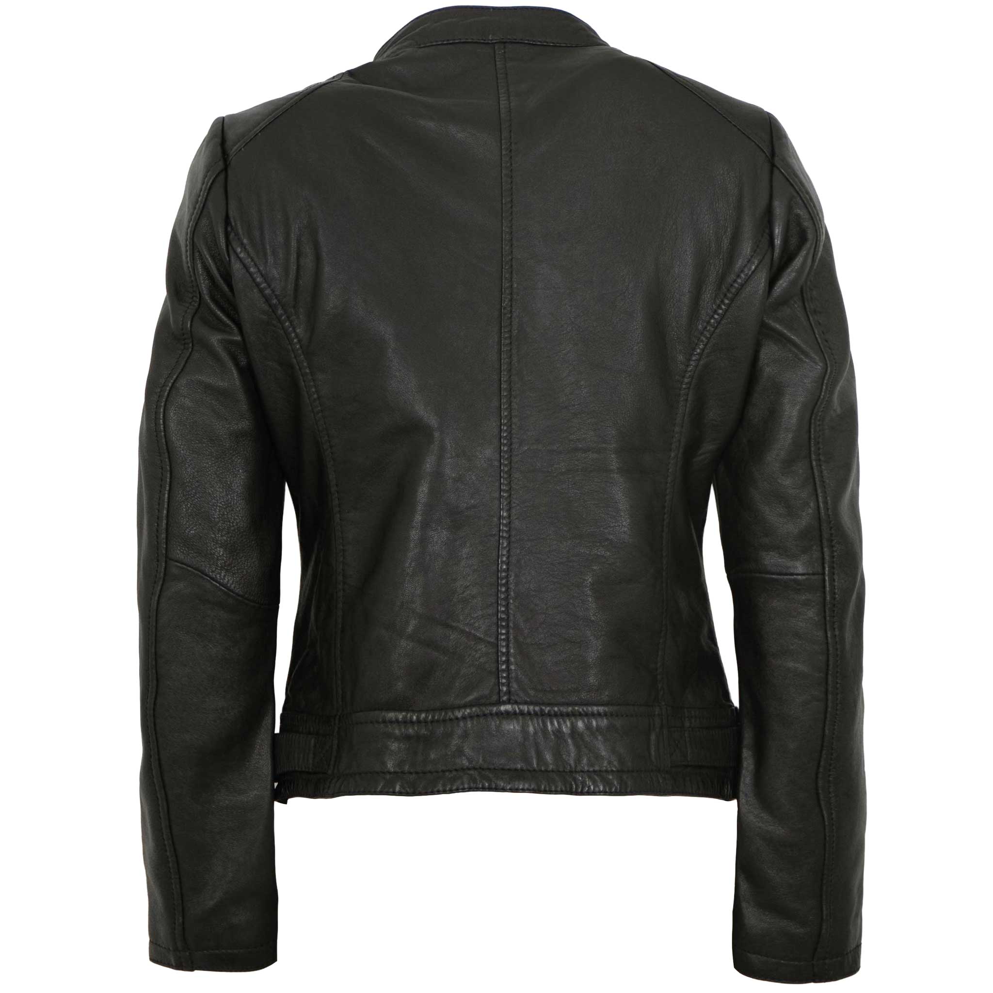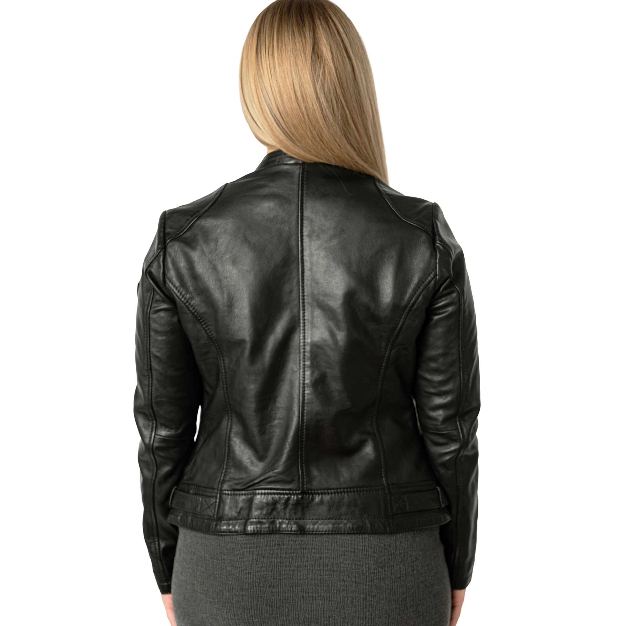 Zwei seitliche Taschen mit Reißverschluss bieten praktischen Stauraum und unterstreichen den modernen Charakter der Jacke. Der kurze Stehkragen sowie die seitlichen Druckriegel setzen dezente, modische Akzente und runden das angesagte Design perfekt ab. Eine stilvolle Lederjacke für Frauen, die hochwertige Materialien, Komfort und einen modernen Look schätzen.