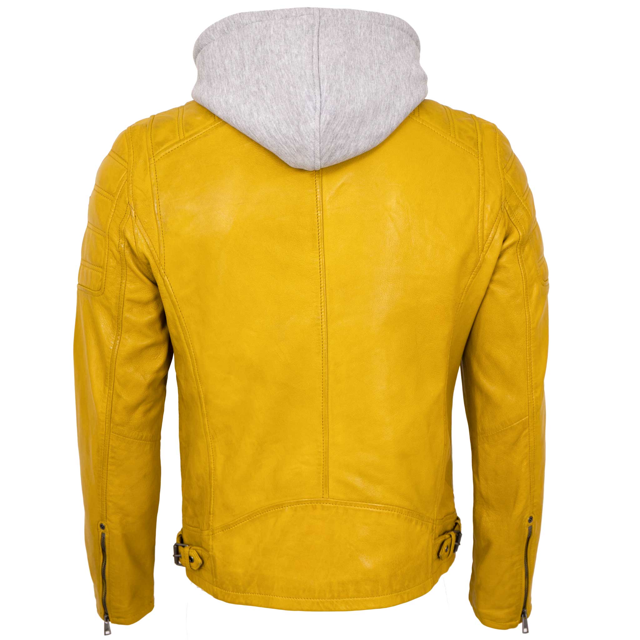 Durch den abnehmbaren, hellgrauen Kapuze-Einsatz lässt sich die Jacke im Handumdrehen verwandeln – vom lässigen Streetwear-Look mit Hoodie-Vibe hin zu einer cleanen Bikerjacke mit Stehkragen und Druckknopf-Riegel. Zwei seitliche Taschen mit Reißverschluss bieten sicheren Stauraum, während die verstellbaren Riegel am Bund eine individuelle Weitenregulierung ermöglichen. Mit dieser Herren Lederjacke Bringen Sie Farbe in Ihre Garderobe!