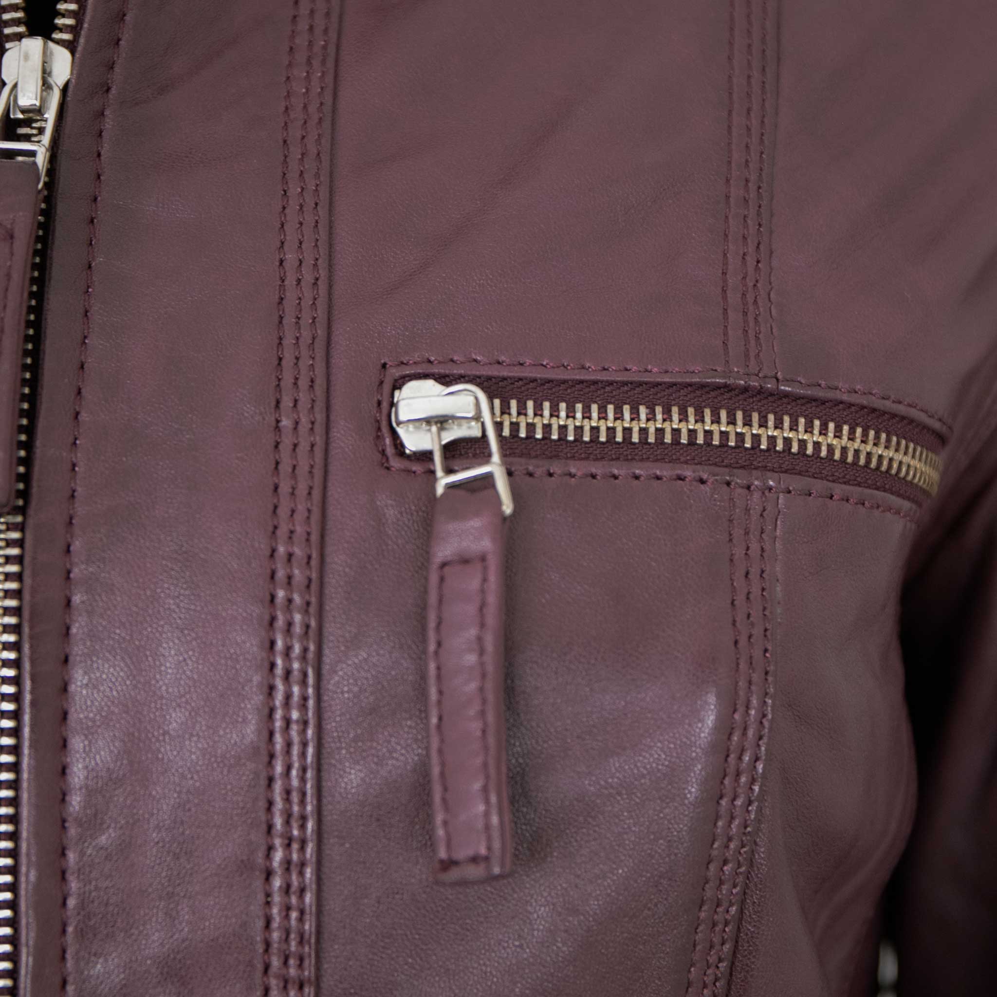 Zwei Brusttaschen mit Reißverschluss sowie seitliche Taschen mit Reißverschluss bieten praktischen Stauraum und setzen gleichzeitig stilvolle Akzente. Der Stehkragen mit Druckknopf verleiht der Jacke eine edle Note und schützt zusätzlich vor Wind. Ob lässig zur Jeans oder als stilvoller Kontrast zu femininen Outfits – diese Lederjacke lässt sich vielseitig kombinieren und passt zu nahezu jedem Anlass.