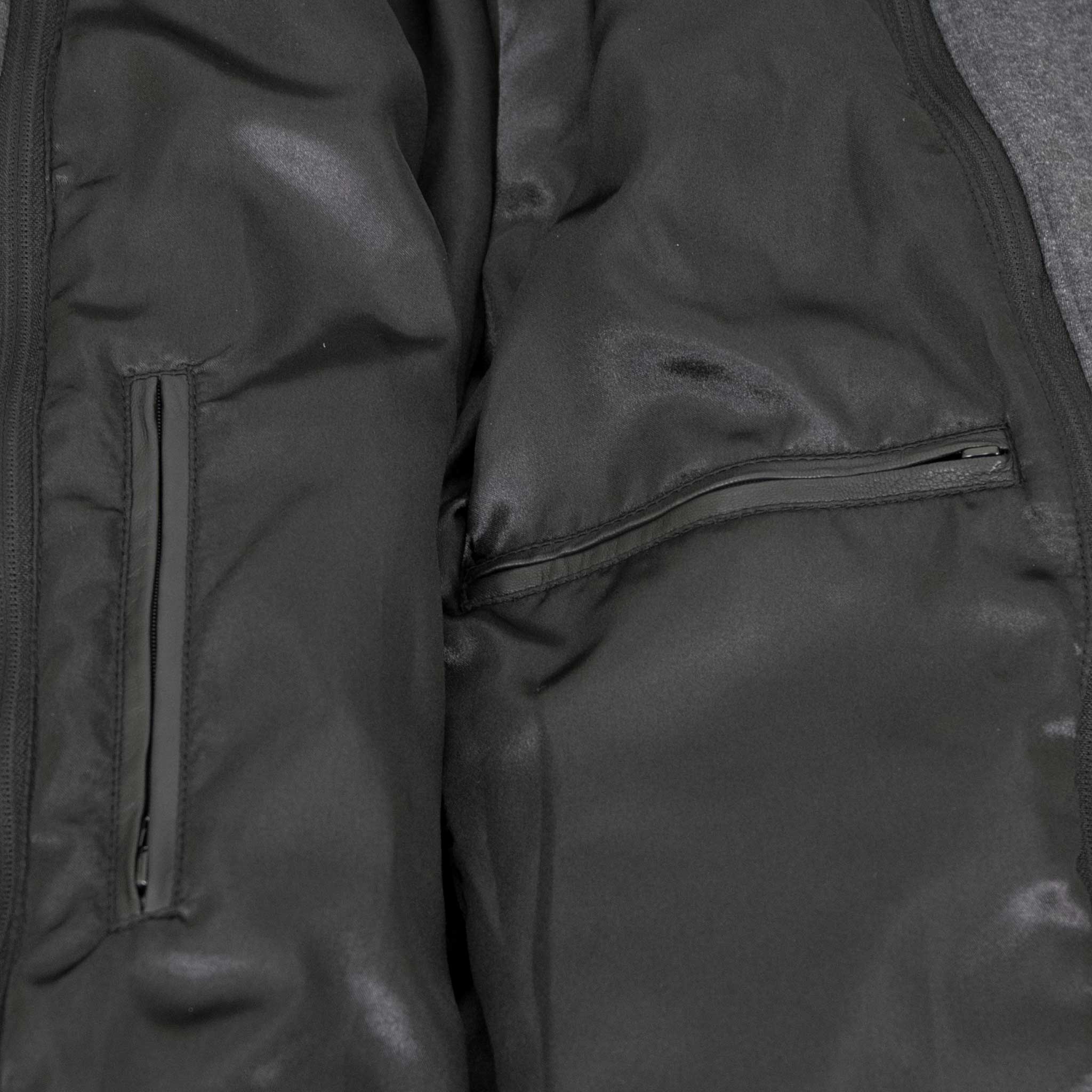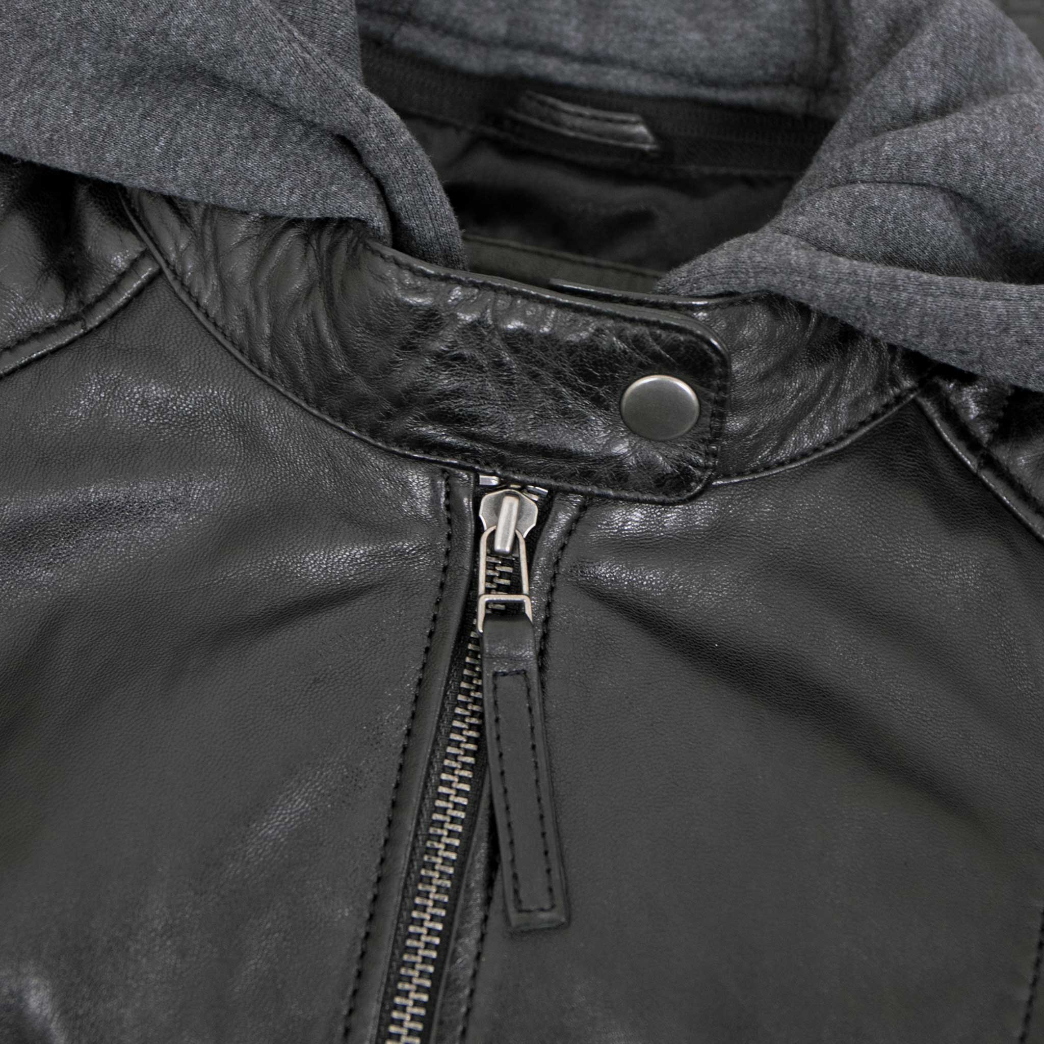 Ein besonderes Highlight ist der integrierte Kapuzen-Einsatz in Grau-Melange, der sich dank Reißverschluss einfach entfernen lässt. Ohne Kapuze verwandelt sich das Modell im Handumdrehen in eine klassische Bikerjacke und eröffnet damit vielseitige Kombinationsmöglichkeiten für verschiedene Looks und Anlässe. Praktische Reißverschlusstaschen sowie ein robuster Frontreißverschluss ergänzen das designstarke Vielseitigkeitsstück.