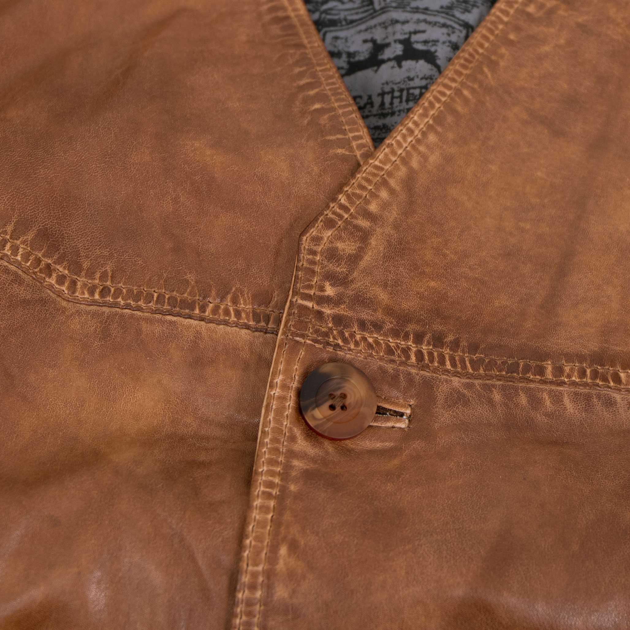 Klassische Details wie der V-Ausschnitt und die Knopfleiste garantieren einen optimalen Sitz und eine zeitlose Optik. Zahlreiche Außentaschen sind nicht nur praktisch, sondern setzen zugleich dekorative Akzente. Ob im Alltag oder in der Freizeit – diese Lederweste ist der perfekte Begleiter für einen maskulinen, authentischen Look.